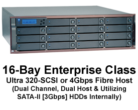 Enterprise Class Hardware RAID and supports levels 0, 1 (0+1), 3, 5 and 6 - in a Powerful 16-Bay SCSI-320U, or Fibre 4Gb host interface that gives you up to 8000GB of blazing speed, easy to manage redundant & secure RAID.