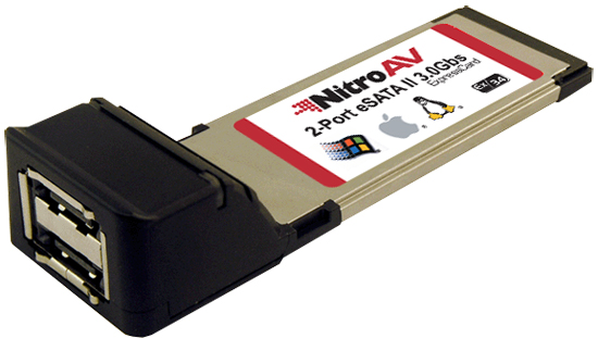 2-Port NitroAV eSATA II 3Gb/s Professional Express Card (34mm) Interface Adapter for Macintosh, Linus and Windows operating systems. The SATAStar 34mm Express Card allows extreme portable performance enabling you to capture, develop, edit and create content in almost any environment when using Apple's new MacBook Pro, Windows or Linux-based express card based computers.